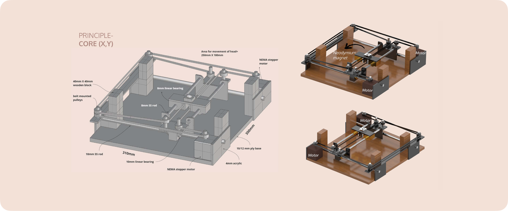 The hardware consists of 2 stepper motors moving a central ‘head’ using a system of pulleys. The head is mounded with a neodymium magnet.