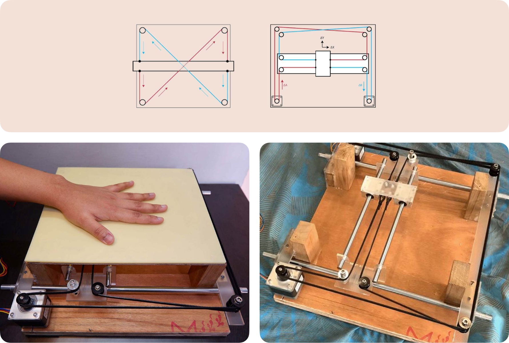 The pulley system is based on the Core XY principle similar to a standard drafting table, where rotating both motors in the same direction produces horizontal motion, while rotating both motors in opposite directions produces vertical motion.